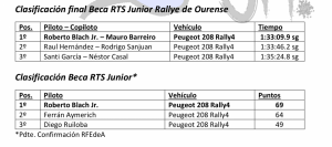 Roberto Blach Jr., exultante tras el gran resultado obtenido: “Hemos cumplido nuestro objetivo, que era vencer dentro de la Beca RTS Junior y pelear por la victoria en la Peugeot Rally Cup Ibérica. Este resultado nos impulsa en ambos certámenes, por lo que nos vamos de vacaciones con buenas sensaciones y con ganas de regresar a finales de septiembre a seguir peleando por los triunfos a bordo de nuestro Peugeot 208 Rally4, que aquí ha estado perfecto durante todo el fin de semana, aguantando las altas temperaturas y los duros tramos ourensanos».