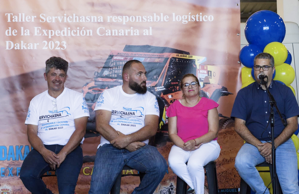 La primera parada fue el Taller de Servichasna en San Miguel de Abona. Servichasna será el responsable logístico de la Expedición Canarias Dakar 2023, siendo de esta manera una parte muy importante de lo que va a ser la propia carrera. Allí, Pedro Peñate coincidió con Lot García Delgado, Teniente Alcalde de San Miguel de Abona, Rosa Albina Ramos Cabello, concejala de Turismo de San Miguel de Abona, y Carlos González, responsable logístico de la expedición y miembro de Servichasna.