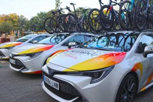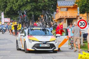 La flota que acompañará a los ciclistas en carrera está formada por seis Toyota C-HR Electric Hybrid, dos Toyota RAV4 Electric Hybrid y dos Toyota Corolla Touring Sports Electric Hybrid. Se trata de tres de los modelos híbridos eléctricos más versátiles de la gama Toyota por a su habitabilidad, gran capacidad de carga, y por su eficiencia y confort de marcha gracias a su motorización híbrida eléctrica.