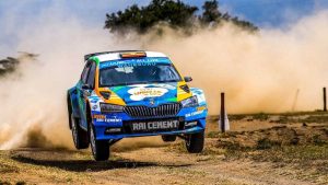 Leroy Gomes quedó a casi 10 minutos de distancia en el cuarto lugar, el piloto zimbabuense retrocedió en la última especial cuando su Ford Fiesta Rally2 se detuvo y no pudo volver a arrancar después de un cruce de agua.