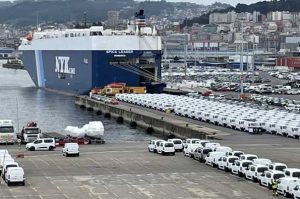 El mar es la puerta de salida más importante para la producción de la planta de Stellantis en Vigo, una fábrica que en este momento está trabajando a pleno rendimiento con un ritmo de producción 2.300 coches al día, aproximadamente 493.000 coches al año de los que el 75 por ciento sale de la fábrica por mar, el 22 por ciento por carretera y un 3 por ciento por ferrocarril.