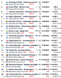 Ogier, ocho veces campeón del mundo, se vio favorecido por el drama que se estaba desarrollando y llevó su Yaris a casa a 1min 22.7s del podio en la cuarta posición de la general, mientras que Oliver Solberg completó los seis primeros. El joven de Hyundai sufrió una penalización de 1min 30s después de reparar la suspensión de su coche en el enlace y se quedó a más de 12 minutos de los líderes al final de la jornada.