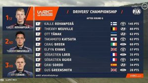 Fue un fin de semana para olvidar para el fabricante coreano, ya que el i20 N del estonio Ott Tänak también se quedó fuera por la rotura del eje de transmisión en el penúltimo tramo y se retiró por segunda vez por un fallo en la dirección asistida el domingo. Ambos pilotos se mantuvieron en la segunda y tercera posición del campeonato y Neuville obtuvo cinco puntos extra al ganar el Wolf Power Stage.
