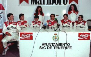 Rueda de prensa al término del XXIII Rallye Isla de Tenerife (1991). José Manuel Nuez, entonces redactor gráfico, plasmó las imágenes del pódium vencedor.