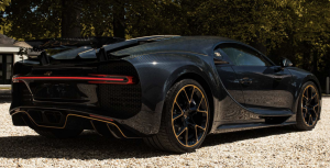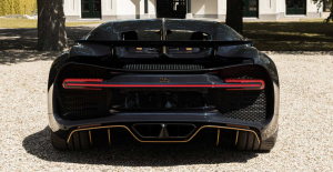 Tres líneas finas, minimalistas pero no obstante llamativas de color dorado se extienden desde la parte delantera hasta la trasera a través de la carrocería de carbono “Blue Royal”, creando un contraste impresionante. El carbono visible “Blue Royal” tiene un aspecto elegante y deportivo y recuerda a los sofisticados modelos touring de Ettore Bugatti. Con el acento dorado, Bugatti enfatiza los contornos elementales del Chiron. Para las líneas del vehículo, la marca se inspiró en el diseño del auto de carrera Tipo 57 G Tank, que ganó las 24 Horas de Le Mans en 1937. Con la cubierta especial del motor con acabado dorado, el famoso motor W16 de 8.0 litros de Bugatti es verdaderamente resplandeciente en estos modelos finales de Chiron. La parte inferior del alerón trasero también está adornada con letras doradas «L’Ébé».