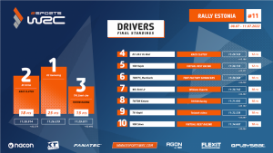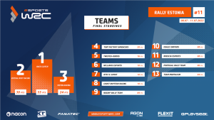 Se trata de la segunda victoria consecutiva del equipo con sede en Francia. Aunque el tricampeón del mundo, Nexl, ha sido el equipo Izamusing el que ha salido de la sombra esta temporada. Con la victoria en Estonia, Izamusing se sitúa ahora segundo en la general del campeonato de pilotos, con 48 puntos de ventaja sobre Hujda, noveno, lo que significa que su puesto en la final Mundial de eSports WRC, presentada por AGON by AOC, está prácticamente garantizado.