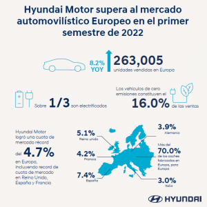 Además de una cuota de mercado récord del 4,7% en Europa, Hyundai también alcanzó cuotas de mercado récord en el Reino Unido, España y Francia en los primeros seis meses de 2022.
