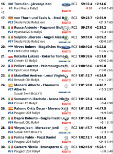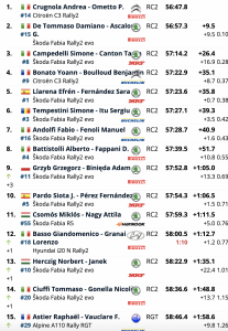 El segundo paso de Santopadre – Fontana Liri también resultó fructífero para el francés Yoann Bonato, que escaló del sexto al cuarto puesto de la general. Terminó a solo 8,7 segundos de Campedelli, con el líder del campeonato, Efrén Llarena, a solo siete décimas de segundo en quinto lugar.