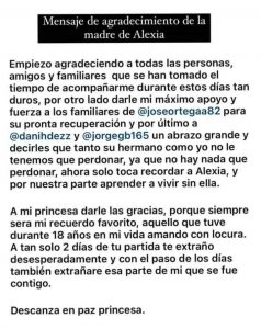 La madre de Alexia: «Dani y Jorge, un abrazo grande y tanto su hermano como yo no le tenemos que perdonar, porque no hay nada que perdonar»