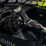 Se pueden ver detalles extremadamente precisos en el interior del vehículo, incluido un volante de ladrillos LEGO decorado con la famosa insignia de Lamborghini y la bandera italiana, un panel de instrumentos y asientos de carreras.