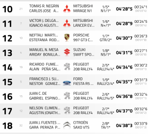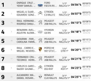 Quintos son Giovanni Fariña y Carolina Fariña (Peugeot 208 Rally4), a sólo 1.6 del cuarto lugar y a 6.2 del tercero y primero de la Rally Cup.