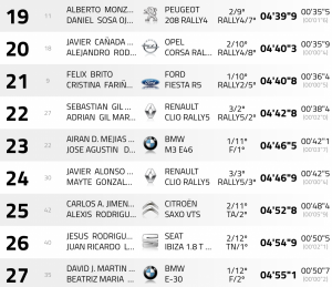 Terceros se sitúan Raúl Hernández y Rodrigo Sanjuán (Peugeot 208 Rally4), que no paran de sorprender, a 8.9 de la cabeza y a 5.4 del segundo lugar, seguidos de Benjamín Avella-Agustín Alemán con el Hyundai i20 R5 ex Iván Ares, estando descolgados de los anteriores, a 13.7 del liderato, a 10.2 del segundo lugar, y a 4.8 del tercero.