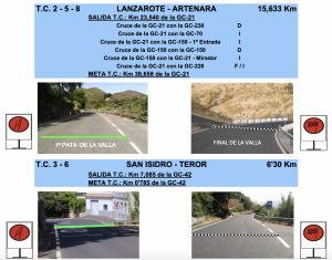 El 41º Rallye Villa de Teror se disputará en ocho (8) Tramos Cronometrados sobre un total de 82,100 kilómetros aproximadamente. Las Especiales localizadas en la zona natural del Rallye serán: Los Castillos-Zumacal con 7,54 kms.; Lanzarote-Artenara, el más largo con 15,63 kms. y San Isidro-Teror disputándose en 6,30 kms.