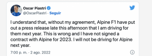 «Entiendo que, sin mi acuerdo, Alpine F1 ha sacado un comunicado de prensa a última hora de la tarde diciendo que voy a conducir para ellos el próximo año», escribió el piloto que ha sido parte de la academia de Alpine.