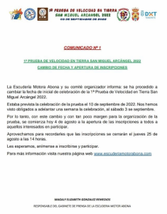 La Escudería Motora Abona y su comité organizador informa que se ha procedido a cambiar la fecha de inicial de celebración de la 1ª Prueba de Velocidad en Tierra San Miguel Arcángel 2022.Estaba prevista la celebración de la prueba el 10 de septiembre de 2022., pero desde la organización «nos hemos visto obligados a adelantar una semana la celebración, al sábado 3 se septiembre. Por lo tanto, con este cambio y con tan poco margen para la organización de la prueba, se comienza desde este 4 de agosto a la apertura de las inscripciones a todos a aquellos interesados en participar».«Aprovechamos para recordarles que las inscripciones se cerrarán el jueves 25 de agosto a las 14 horas. Les esperamos, anímense a inscribirse y participar», detalla.Para más información visita nuestra página web www.escuderiamotorabona.com