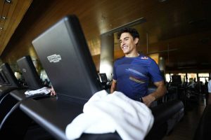 Su actual rutina de entrenamiento se centra en correr, nadar y mejorar la resistencia en el gimnasio con ejercicios elásticos. Cada semana se añade lentamente peso y resistencia para aumentar la fuerza sin exigir demasiado al cuerpo.