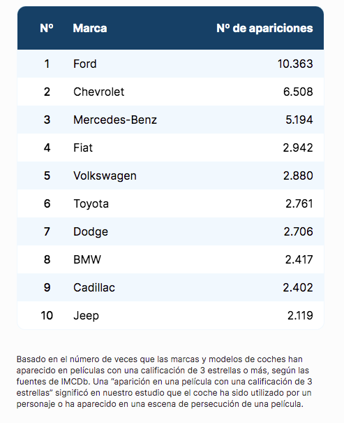 Ford es la marca de coches que más veces ha aparecido en la historia del cine por aparecer en cintas con una calificación de 3 estrellas o más, según las fuentes de IMCDb.
