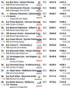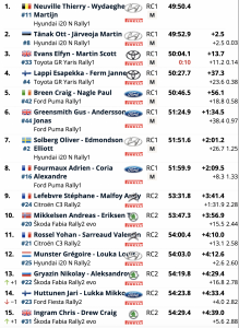 Espekka Lappi bromeó diciendo que estaba «liderando la clase de los neumáticos equivocados» y llevó su Yaris a casa a 23,6 segundos del podio. Tenía 18,8 segundos de ventaja sobre el piloto de M-Sport Ford, Craig Breen, que se mantuvo quinto en la general a pesar de un exceso de velocidad al principio del día.