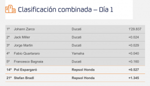 Pol Espargaró, que ha sido uno de los protagonistas del día al anunciar su futuro para la temporada que viene, ha ido de menos a más en una jornada en la que ha empezado registrando el vigésimo primer tiempo en la primera sesión y el decimocuarto en la segunda. Con un crono de 1 minuto, 30 segundos y 364 milésimas, el piloto del equipo Repsol Honda tendrá que mejorar su registro en la FP3 de mañana si quiere clasificarse directamente para la Q2.