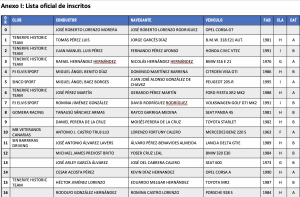 Una amplia lista que encabezan los principales tenores de ambos campeonatos y en la que figuran con el #1 Tomás Pérez y Jorge Garcés, a los que seguirá el que podríamos denominar equipo revelación de la temporada formado por Juan Manuel Luís y Fernando Pérez. Destacar también la vuelta a la competición del equipo gomero formado por Tanausú Sánchez y Rayco Garriga en las labores de navegante.