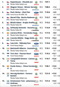 Adam Brezík estaba detrás de Mareš con solo cinco décimas de segundo por delante del recién coronado campeón del ERC Efrén Llarena, quien completó un top cinco de Fabia a pesar de sufrir problemas al principio. Un problema con el embrague hizo que el español tuviera que salir disparado desde la línea de salida después de perder 9,9 segundos con respecto al líder Kopecký en la etapa.