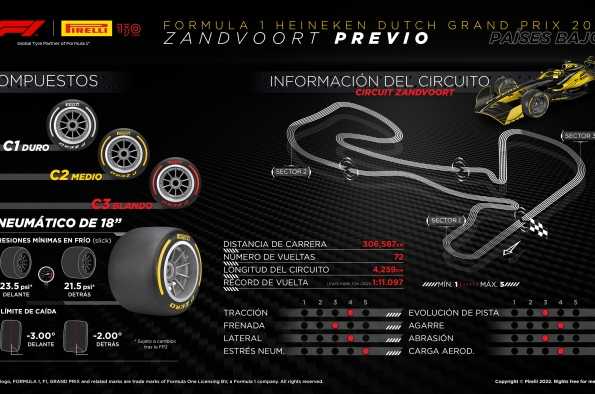 “El nuevo reglamento debería facilitar los adelantamientos” “Zandvoort fue una incorporación espectacular el año pasado. Su trazado se mostró muy desafiante para los neumáticos, en particular las curvas peraltadas 3 y 14, que se toman a alta velocidad y que, en consecuencia, generan exigencias combinadas para el coche a nivel de fuerza: tanto aerodinámicas como laterales. La suma de desafíos que implica el trazado nos ha invitado a optar por los tres compuestos más duros por cuarta vez este año, tras Baréin, España y Gran Bretaña. El nuevo reglamento en vigor debería facilitar los adelantamientos en una pista en la que estas maniobras se revelaron muy difíciles en 2021, cuando la mayoría de pilotos optaron por parar una sola vez para conservar la posición en pista. En esta ocasión, seguramente veremos una mayor concentración en las gomas más blandas, lo que debería poner sobre la mesa estrategias a dos paradas y así ayudar a los corredores a atacar más”.