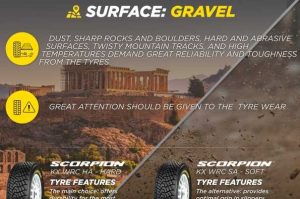 - Compuesto blando: 8 Scorpion K6B para la categoría WRC2 y 8 K6 para WRC3.