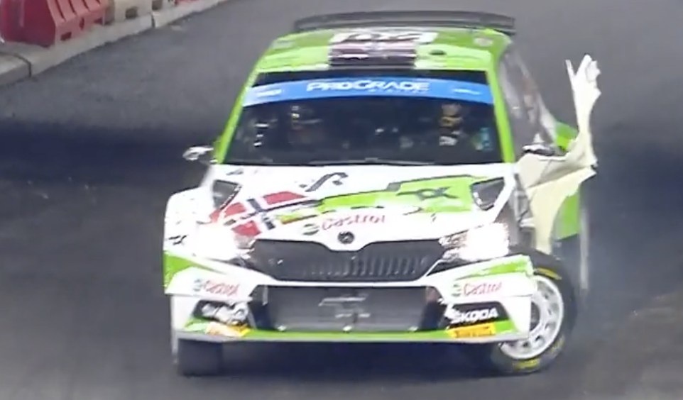 El noruego llevaba demasiada velocidad al pasar por un puente y su Škoda Fabia Rally2 Evo se fue por los aires, dejándole sin espacio suficiente para frenar en la cerrada curva a la derechas que seguía.