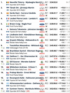 Así las cosas el paso de los tramos propició que el podio lo conformaran otros equipos, terminándose la jornada con un triplete de Hyundai Motorsport, con los belgas Thierry Neuville y Martijn Wydaeghe (Hyundai i20 N Rally1) como líderes y medio minuto de renta sobre sus compañeros de equipo, los estonios Ott Tänak y Martin Järveoja (Hyundai i20 N Rally1), siendo terceros, otra carrera más, los españoles Dani Sordo y Cándido Carrera (Hyundai i20 N Rally1).