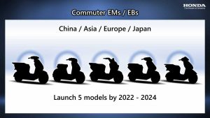 Anticipándose a la expansión del mercado, Honda lanzará motocicletas eléctricas que cubrirán una amplia gama de requisitos de cliente. Entre Commuters y modelos Fun, Honda ha previsto lanzar un mínimo de diez modelos de motocicletas eléctricas en 2025, con el objetivo de aumentar la venta de modelos eléctricos hasta un millón de unidades en los próximos cinco años. En 2030, esta cifra aumentará hasta los 3,5 millones de unidades, el equivalente al 15% de las ventas de unidades totales.