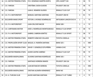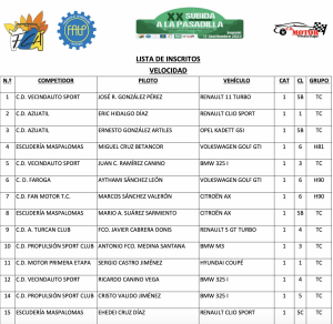 En Velocidad, destacan Miguel Cabral (Mitsubishi Evo X) José Manuel González (Porsche 991 GT3) Gustavo Bolaños (Mitsubishi Evo VII) Ayoze Benítez (Porsche 997 GT3) y la vuelta a la competición de Cristian Alemán (BMW M3) entre otros. Sin olvidarnos de las barquetas, como la Norma M20F de Wlly Rodríguez.