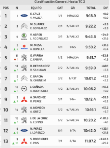 Terceros son los tinerfeños Víctor Abreu y Luis Alberto Rodríguez (Skoda Fabia R5), mucho más alejados de los dos primeros, a 24.9 del primer puesto y superando en 6.4 a al tinerfeño Manolo Mesa y al lanzaroteño Ariday Bonilla (Suzuki Swift Sport R+ N5), cuartos, siendo quintos los tinerfeños Giovanni Fariña y Carolina Fariña (Peugeot 208 Rally4), primeros de la Rally Cup.