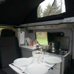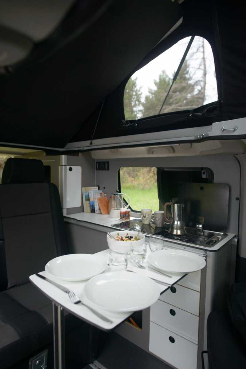 La versión by Tinkervan incluye en su oferta una práctica cama extraíble de viscoelástica junto a una tapicería desenfundable que facilita las labores de limpieza, así como una mesa interior que también puede ser utilizada fuera del vehículo. En la parte eléctrica, incorpora una batería auxiliar junto con su cargador más dos tomas de 12voltios y otras dos tomas dobles USB de 4,2 Ah.