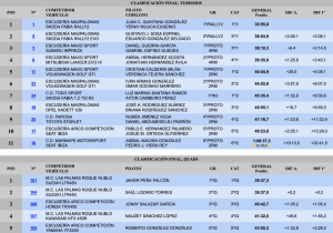 Cuartos finalizaron Aníbal Hernández y su hijo Jonathan (Mitsubishi Lancer Evo IX), seguidos de los ganadores del apartad de dos ruedas motrices (TC3), Cristian Calderín-Verónica Tejera (Volkswagen Golf GTI), quintos.