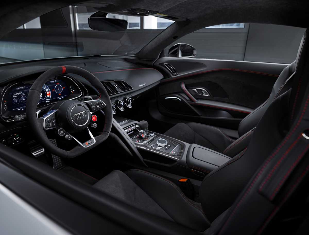 En el interior, Audi Sport GmbH continúa su homenaje al primer R8 GT de 2010. El interior está diseñado en una combinación de negro y rojo, incluyendo cinturones rojos, solo disponibles en el R8 GT de hace 12 años. Las alfombrillas y los asientos individuales del R8 presentan las letras del modelo especial en negro y rojo. Un aspecto destacado: los clientes pueden encontrar la numeración secuencial de su R8 GT en el medio de la palanca de cambio, parcialmente mate en la incrustación de carbono.