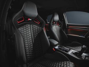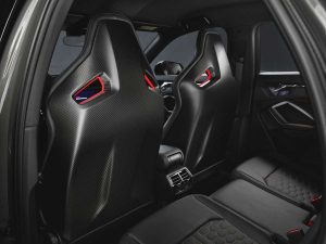 Los pasajeros pueden acomodarse en los nuevos asientos RS exclusivos de esta edición, que lucen unos impresionantes emblemas RS en el respaldo. Una de las características más llamativas es el revestimiento trasero en carbono mate del respaldo de los asientos, que se utiliza por primera vez en el RS Q3. Los asientos de tipo bucket están tapizados con una combinación de cuero y Dinamica en color negro y negro azabache, una nueva mezcla que resulta especialmente deportiva y elegante. El material Dinamica es una microfibra compuesta por alrededor de un 45% de fibras de plástico de polietileno reciclado que, además de en los asientos, también se utiliza en el revestimiento de algunas zonas del salpicadero. Las costuras en color cobre crean un contraste especial que se puede apreciar, por ejemplo, en la banqueta de los asientos, en el reposabrazos central y los reposabrazos de las puertas, en el volante y en las alfombrillas. La pantalla táctil de 10,1 pulgadas del MMI, con su apariencia de carbono, presenta la inscripción con el número de serie de cada unidad de la edición limitada. Los embellecedores retroiluminados de los umbrales de las puertas, específicos de esta edición, proyectan en el suelo un diamante rojo en 3D cuando se abren las puertas.
