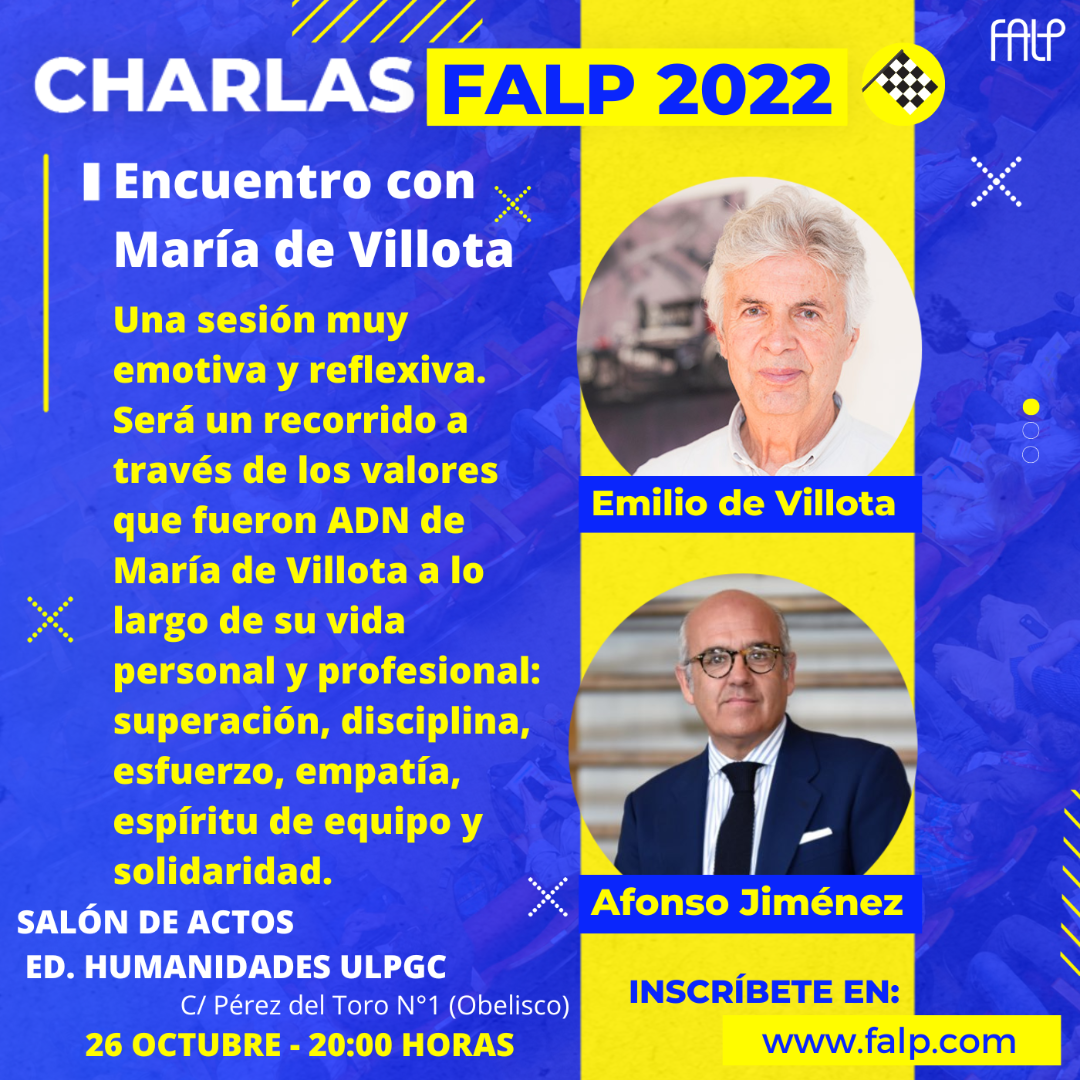 Dentro del ciclo de las Charlas-FALP organizadas para todo el colectivo del automovilismo del ámbito de la Federación Interinsular de Las Palmas, el próximo 26 de octubre a las 20:00 horas, en la Sala de Conferencias del Edificio de Humanidades de la ULPGC, ubicado en la conocida Plaza del Obelisco (C/ Tomás Morales y hora plaza de la Constitución), se desarrollará una Charla FALP muy emotiva. Se trata de la Charla-Encuentro con María de Villota, que impartirán su padre Emilio de Villota y Alfonso Jiménez. Un cierre muy especial al programa de conferencias divulgativas organizadas por la FALP desde el pasado mes de septiembre.