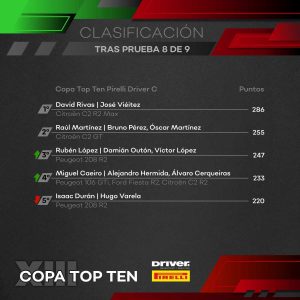 En lo que respecta a la Copa Top Ten Pirelli “C”, fue una auténtica escabechina entre los favoritos al título, que fueron cayendo conforme avanzó la prueba. Isaac Durán y Raúl Martínez abandonaban por sendas averías mediado el rallye, dejando a David Rivas con el camino expedito hacia la victoria y el título.