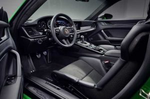 En el equipamiento específico del “T” encontramos las llantas Carrera S de color gris Titanio, de 20 pulgadas delante y 21 detrás, con neumáticos 245/35 y 305/30, respectivamente. El 911 Carrera T también está equipado de serie con el volante deportivo GT, el sistema de escape deportivo y los asientos Sport Plus (ajuste eléctrico de cuatro posiciones). Con un peso de solo 1.470 kilogramos, el 911 Carrera T manual es el 911 de serie más ligero con el motor de entrada, pues pesa 35 kg menos que el 911 Carrera, que tiene de serie el cambio PDK de ocho velocidades. Esa versión no se comercializa con cambio manual. Además de eliminar los asientos traseros y reducir el aislamiento, el peso se reduce aún más al aligerar los cristales y la batería.