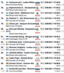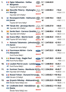 Pierre-Louis Loubet y V Landais, con otro Ford Puma Rally1, cerraban las diez primeras posiciones, siendo undécimos los fineses Teemu Suninen y Mikko Markkula (Hyundai i20 N Rally2(, los más rápidos entre las monturas Rally2 al superar en 32.5 a los galos Yohan Rossel y Arnaud Dunand (Citroën C3 Rally2).