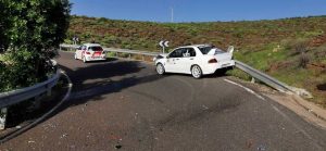El Rally de Maspalomas era testigo del debut de Jesús Rodríguez y Leonardo Perera con su nuevo Mitsubishi Lancer Evo IX, pero la pérdida de frenos le obligó a frena con la valla, dejándolos fuera de carrera.