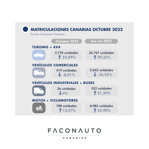 En el resto de mercados, las ventas de vehículos comerciales caen un 16% con respecto al año pasado con 385 matriculaciones. La misma tendencia negativa sigue el mercado de los vehículos industriales y las guaguas, con un 12% de caída de las ventas el pasado mes de octubre, lo que se traduce en 22 unidades matriculadas. Solo se salva el mercado de las dos ruedas, con un muy escaso crecimiento del 6% respecto al año pasado y un total de 730 motos y ciclomotores matriculados.