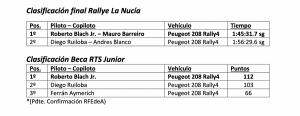 Fin de semana de éxito para Roberto Blach Jr. y Mauro Barreiro, que lograron imponerse en el Rallye La Nucía, lo que les proclamó como vencedores en la Beca RTS Junior, un trofeo promocional organizado por la Real Federación Española de Automovilismo para ayudar a las jóvenes promesas del automovilismo nacional a dar el salto a certámenes internacionales.