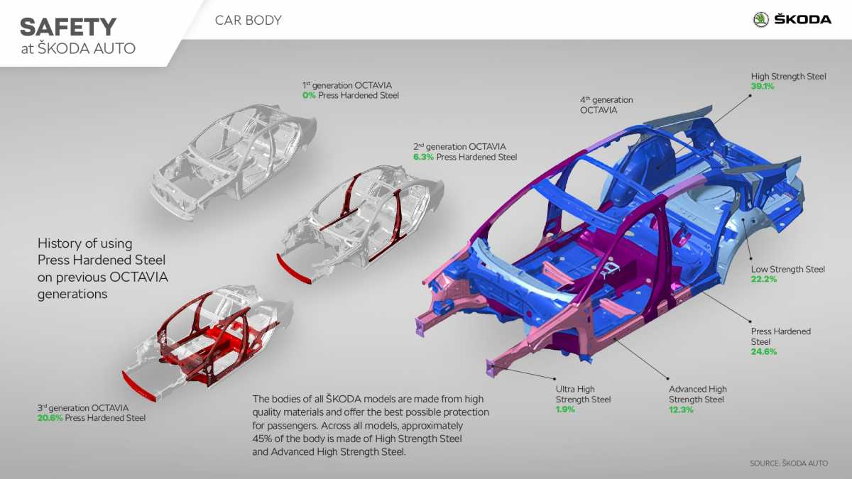 A lo largo de todo el proceso de elaboración del vehículo, ŠKODA AUTO trabaja para garantizar que la carrocería tenga un alto grado de rigidez torsional, asegurando al mismo tiempo que pueda absorber una cantidad considerable de energía. El objetivo es mantener el habitáculo estable durante un accidente para ofrecer la mejor protección a los ocupantes.