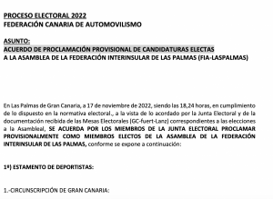 La Federación Canarias de Automovilismo procede al Acuerdo de Proclamación Provisisonal de Candidaturas Electas FALP (Federación de Automovilismo de Las Palmas).
