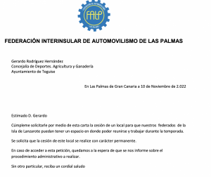 La Federación de Automovilismo de Las Palmas (FALP) ha solicitado un local al Ayuntamiento de Teguise para que sus federados puedan reunirse durante la temporada..
