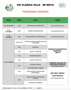La XVI Clásica Villa de Moya cierra las inscripciones este lunes 28 de noviembre, a las 20 horas y se disputará el próximo sábado 3 de diciembre, bajo la organización del CD. Azuatil, que presenta la novedad de la modalidad Trofeo Turístico ideal para la iniciación o para los participantes que deseen un recorrido más ligero para sus vehículos. Los principales datos de esta prueba son en resumen los siguientes: