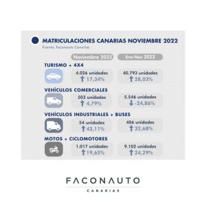 En el resto de mercados, las ventas de vehículos comerciales apenas crecen un 5% con respecto al año pasado con 503 unidades. En el mercado de las guaguas y vehículos industriales, las matriculaciones crecen un 42% respecto a noviembre de 2021, con 54 unidades matriculadas. El mercado de las dos ruedas crece un 20%, con 1.017 motos y ciclomotores matriculados.
