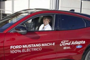 El nuevo Ford Mustang MachE adaptado es el primer vehículo 100% eléctrico diseñado para personas con movilidad reducida que cuenta con asistencia a la conducción, acelerador de puño y freno sobre volante, tabla d e transferencia en conductor y asiento Turny copiloto.