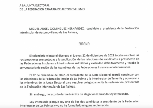 La falta de comunicación y movimientos de la Junta Electoral de la Federación Canaria de Automovilismo, presidida por Juan Hernández, sobre las elecciones a la presidencia de la Federación de Automovilismo de Las Palmas, ha propiciado que el candidato Miguel Ángel Domínguez solicite que se le «entregue una copa de la reclamación -la realizada por el otro candidato, Miguel Ángel Toledo, que entiende que no puede presidir la FALP-, se me tramite audiencia para formular alegaciones para que la Junta Electoral resuelva».